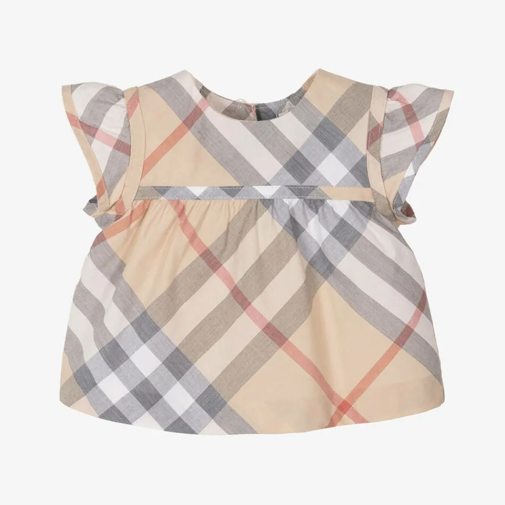 A sweet beige blouse for baby girls by Burberry, in the luxury brand's iconic pale stone check pattern. Soft and lightweight, it is made and lined in organic cotton with lovely little cap sleeves and delicate gathers across the chest. There are neat button fastenings on the back.