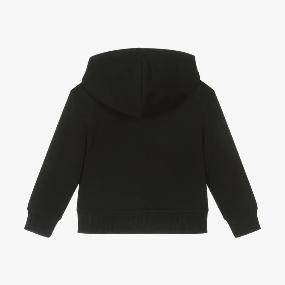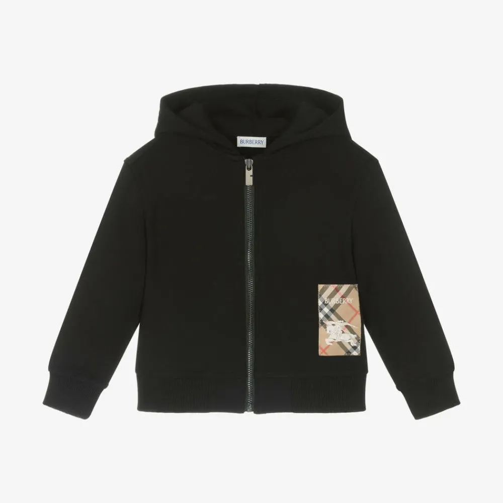 From luxury brand Burberry, a casual black zip-up top for boys and girls in soft organic cotton jersey. It ha side seam pockets and a double layered hood for extra cosiness. The front features a Burberry Check patch, embroidered with the designer's iconic Equestrian Knight Design.