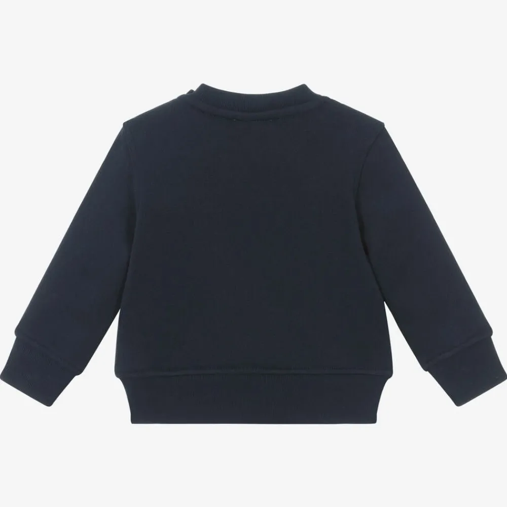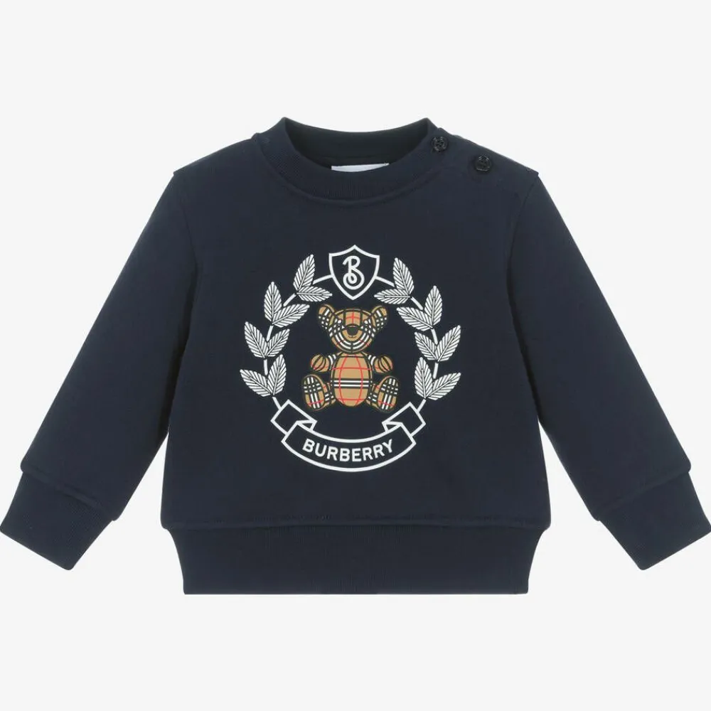 Deep charcoal blue sweatshirt for baby boys and girls by luxury designer Burberry, made in a super soft cotton jersey. This comfortable top has stretchy ribbed trims and button fastenings on one shoulder to help with dressing. It features the brand's signature Thomas Bear on the front along with the Oak Leaf Crest for a distinct designer look. This product contains organic cotton.
