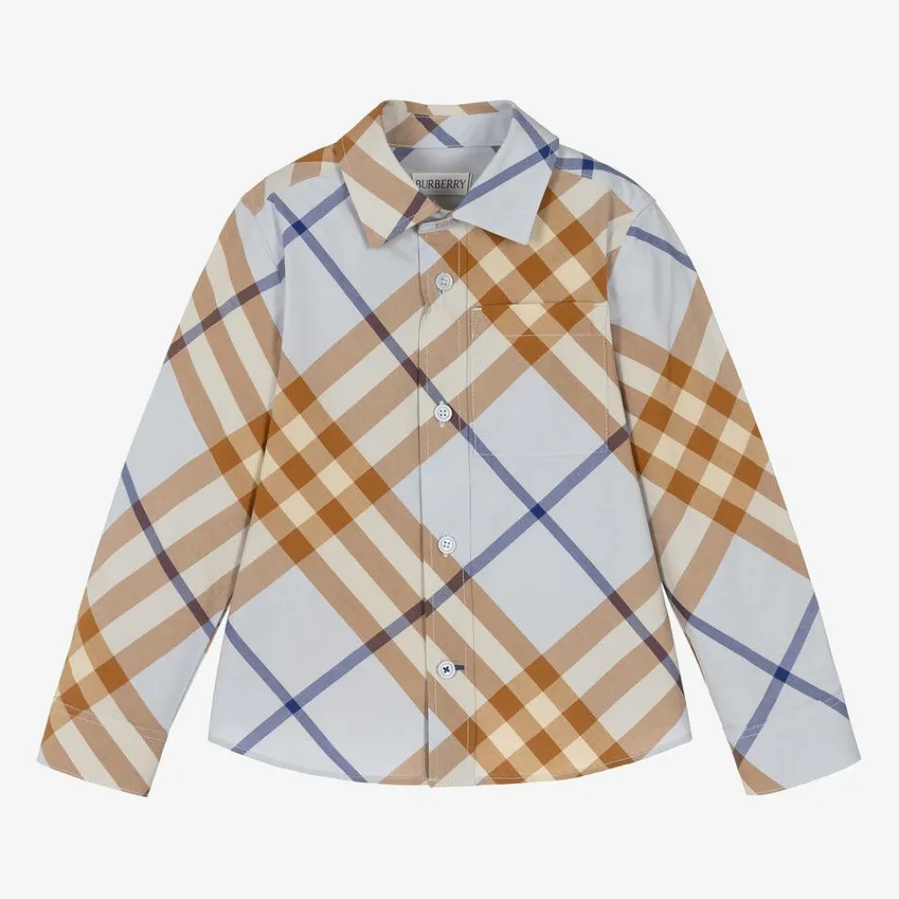 Smart pale blue cotton poplin shirt for boys by luxury British brand Burberry. A new take on the classics, this long-sleeved style is patterned with the Burberry check in blue and beige colourways. It has a button-up front, a chest pocket and a curved hem. This product contains organic cotton.