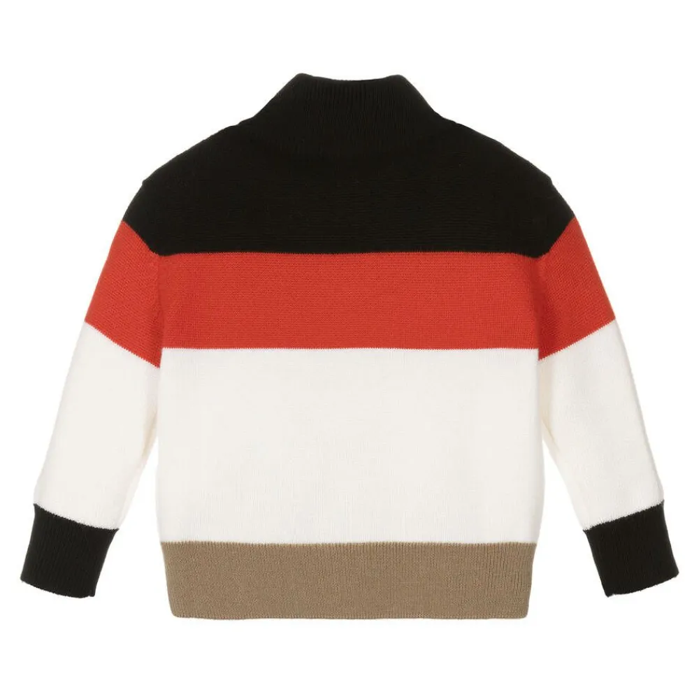 Boys luxury Merino wool zip-up sweater by Burberry, styled in the designer's classic Icon stripe. Featuring bold colours of ivory, beige, red and black, this warm and stylish top has a funnel neck with zip fastening and chin guard and a silicone stamp logo at the chest.