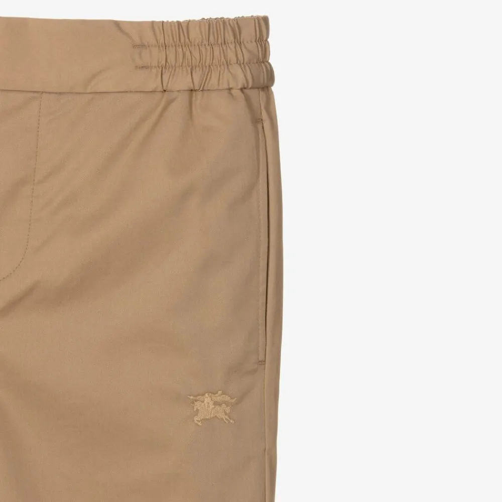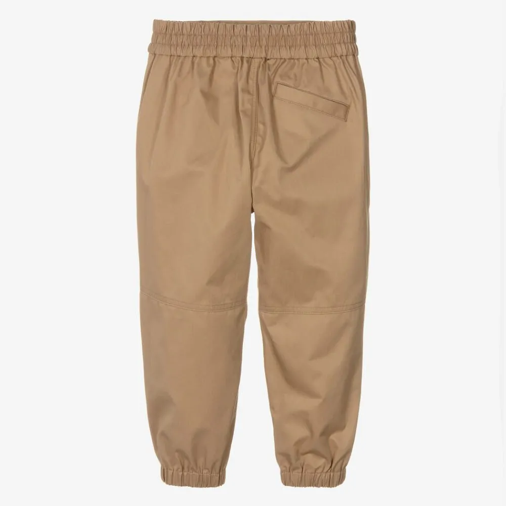 Casual cotton twill trousers for boys by Burberry, in the luxury brand's Archive beige. For a signature look, there is a small Equestrian Knight Design in tonal embroidery on one leg. Simply styled for a relaxed fit, they have elasticated ankle cuffs, knee tucks, discreet side pockets and a back pocket. The elasticated waistband allows easy pull-on.