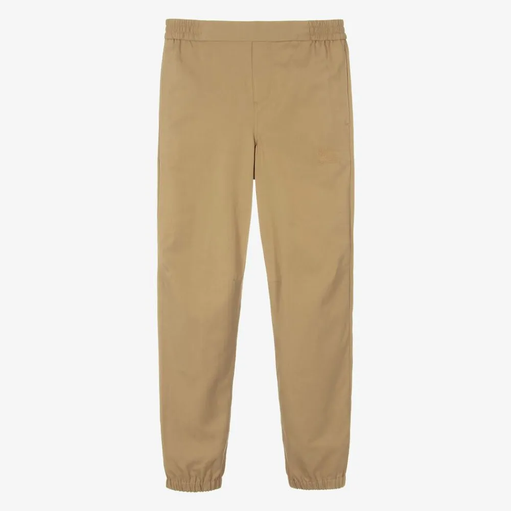 Comfortable for a casual, stylish look, these beige cuffed trousers for boys are from luxury British brand, Burberry. Made in cotton-blend twill with a soft and lightweight feel, they have an elasticated waistband and useful pockets. The Equestrian Knight Device is embroidered in tonal thread for a discreet designer touch.