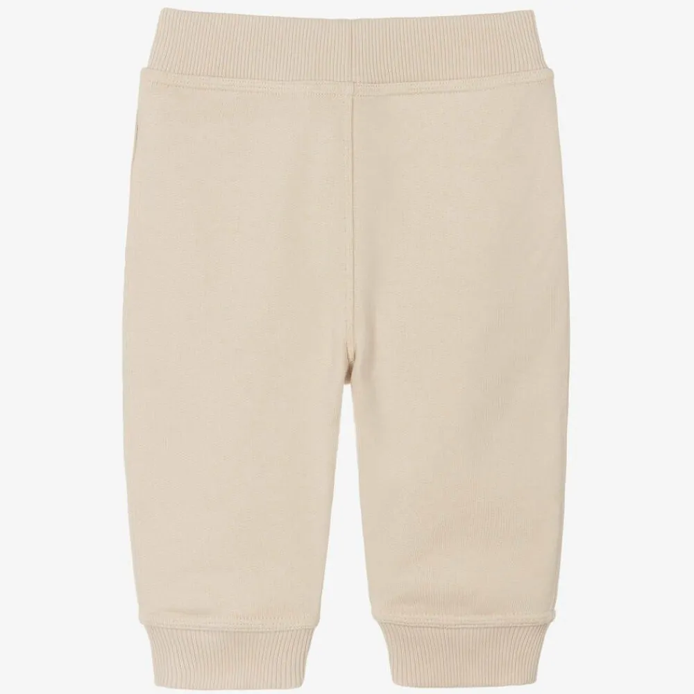 Beige cotton joggers for baby boys and girls by luxury British brand Burberry, made in comfortable, mid-weight jersey. They have a stretchy ribbed waistband, side seam pockets and a silky, Equestrian Knight Design label for instant branded appeal.