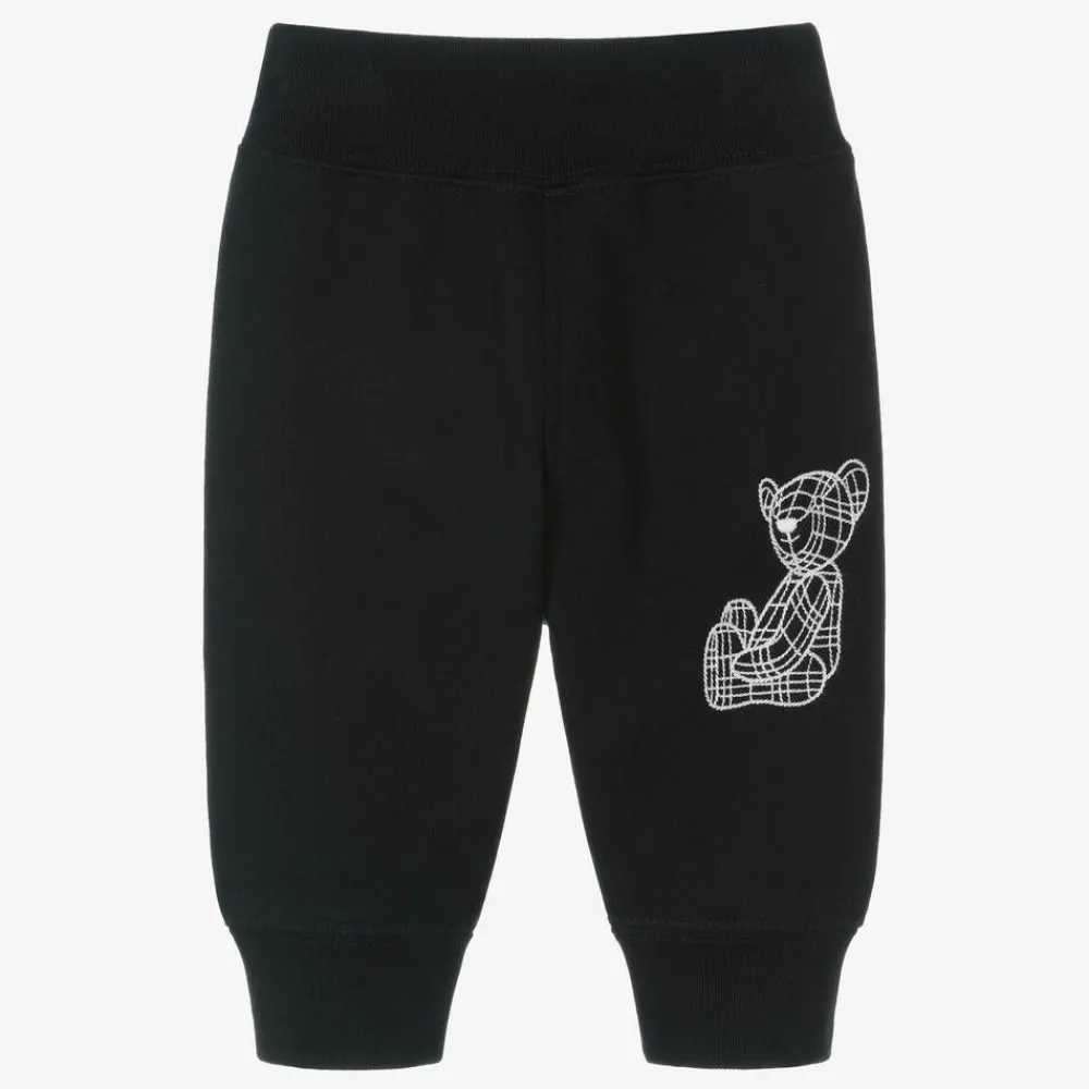 Baby boys black joggers by Burberry, made in soft organic cotton sweatshirt jersey. They have a ribbed waistband and ankle cuffs, with an embroidered Thomas Bear motif on one leg and a Horseferry silicone logo on the back.