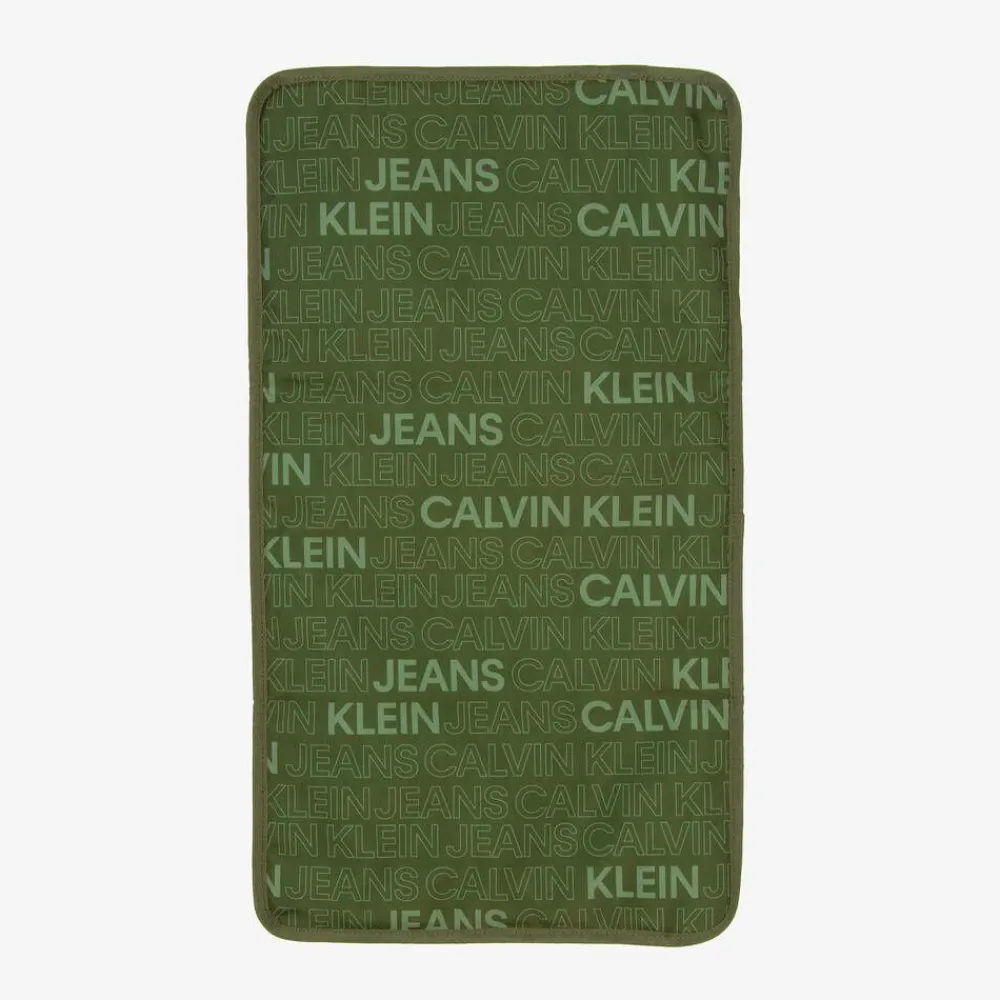 Stylish khaki green changing bag by Calvin Klein, embroidered on the front with the brand's logo for instant designer appeal. Easy to wipe clean, the spacious, zip-fastening compartment has internal pouch pockets to help organise essentials. There is a smaller front compartment and useful side pockets, ideal for bottles. This versatile design has carry handles on the top, adjustable shoulder straps and detachable buggy straps. It comes with a useful, branded changing mat. This product is made with at least 50% recycled fabric.