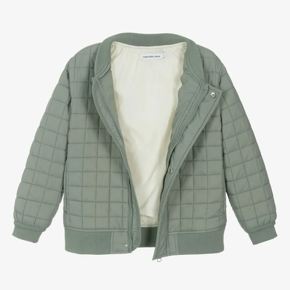 A stylish green quilted jacket for little boys and girls by Calvin Klein. Soft and silky with an ivory satin lining, it has a boxy, bomber-style design with gently ribbed trims. An ideal layer for transitional wear, it is lightly padded and fastens with a zip beneath a popper flap. It has concealed seam pockets for a neat look, and an embroidered tonal CK monogram logo on the chest adds a branded finish. This item is made with at least 95% recycled materials.
