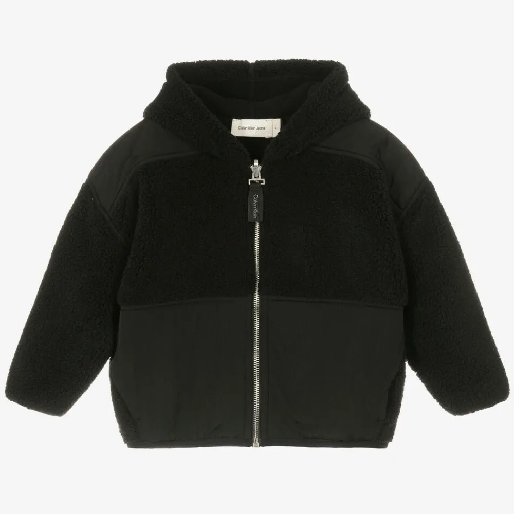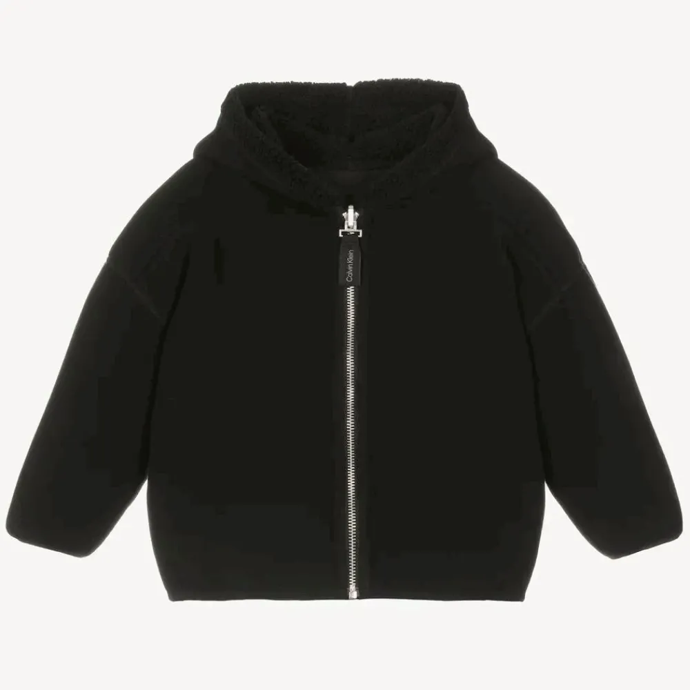 Reversible, black fleece hooded zip-up top for boys by American brand, Calvin Klein. This cosy style features thick sherpa fleece with silky trim and pockets on one side, with soft polar fleece on the reverse. For a discreet designer touch, the front zip fastening has a logo pull tab.