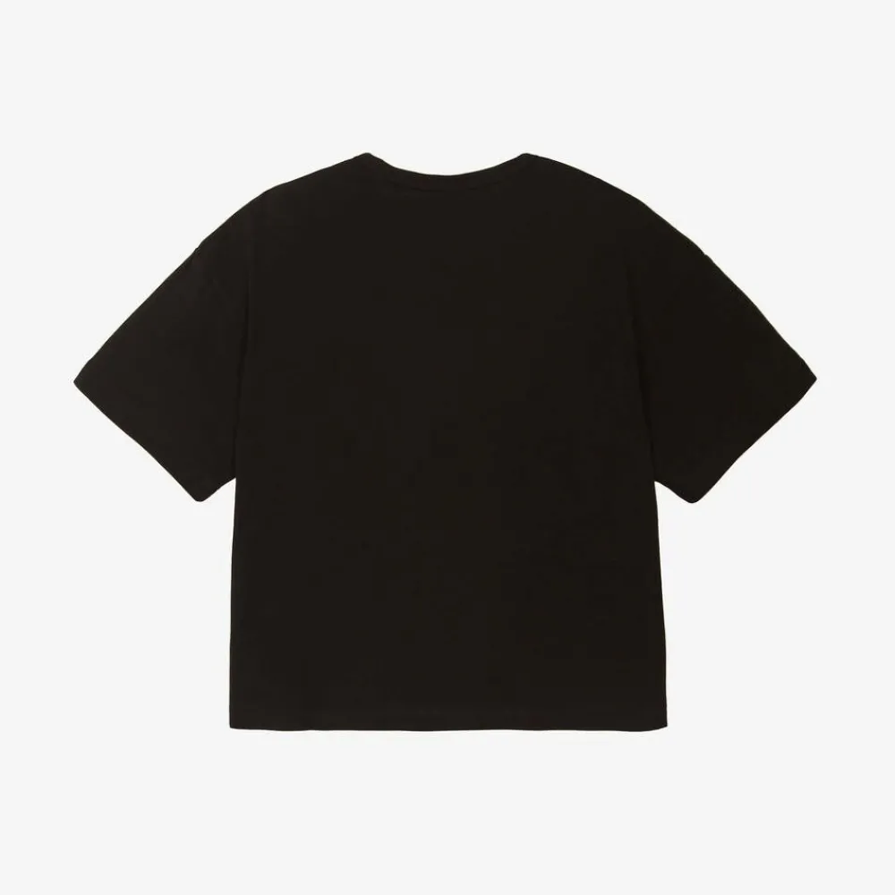 Black T-shirt for girls by Calvin Klein, made in soft organic cotton jersey. A relaxed, boxy fit, this casual tee features a flocked and embroidered CK monogram logo in pink and white.