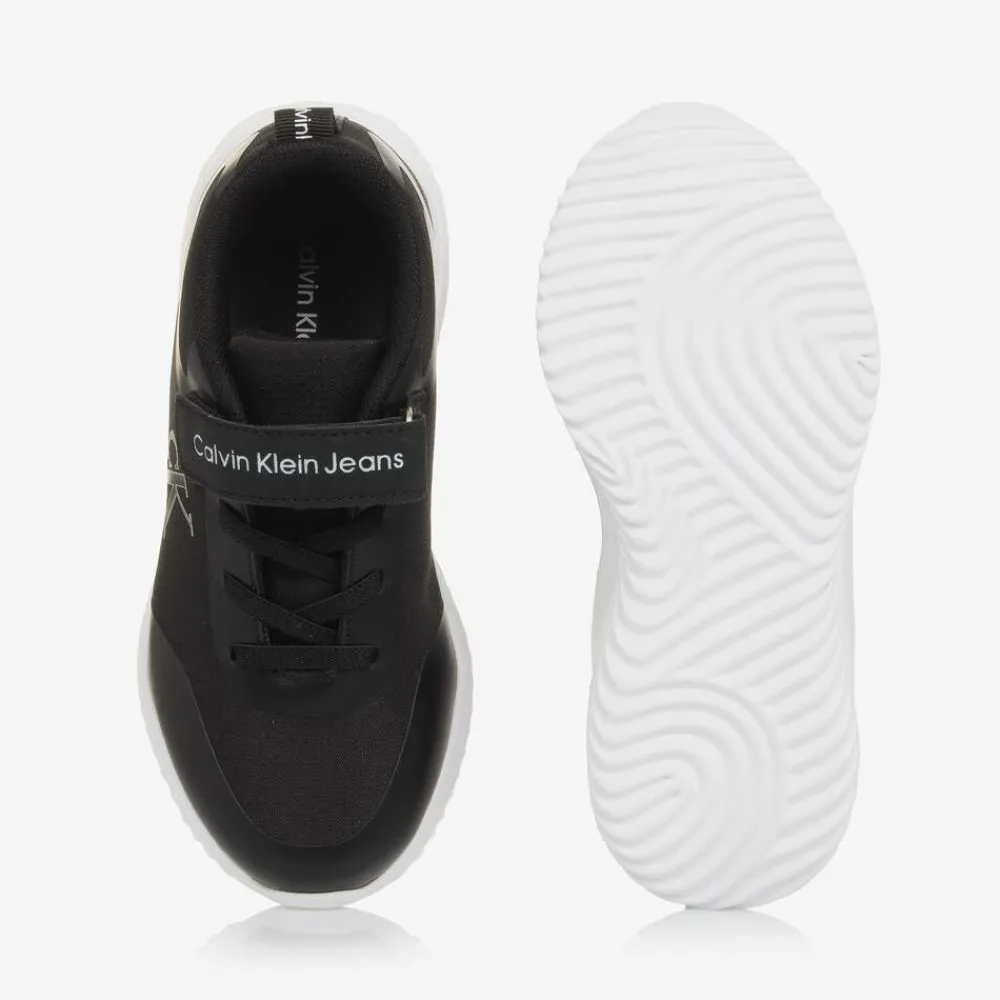 Lightweight black trainers for boys and girls by Calvin Klein, made in textured canvas with faux leather trims. Lined in soft mesh, they have a removable insole, which is lightly padded for comfort. They have faux laces on the front, a velcro fastening strap across the foot and non-slip rubber outer soles. Instantly recognisable they have logo branding on the heel, strap and on the side of the shoe.