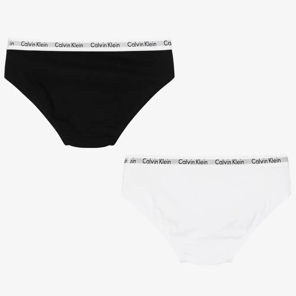 Two pairs of bikini-style knickers for girls by Calvin Klein, one in black and the other in white. Made in comfortable, stretchy cotton jersey, they have an elasticated, logo-branded waistband.