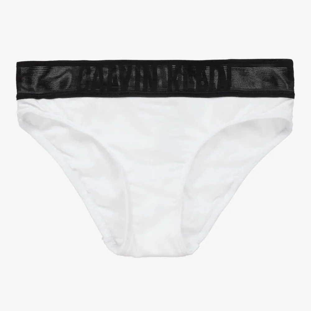 A two-pack pair of bikini-style knickers for girls by American brand Calvin Klein, one in black and the other in white. Made in comfortable cotton jersey, each has a sheer black elasticated logo waistband.