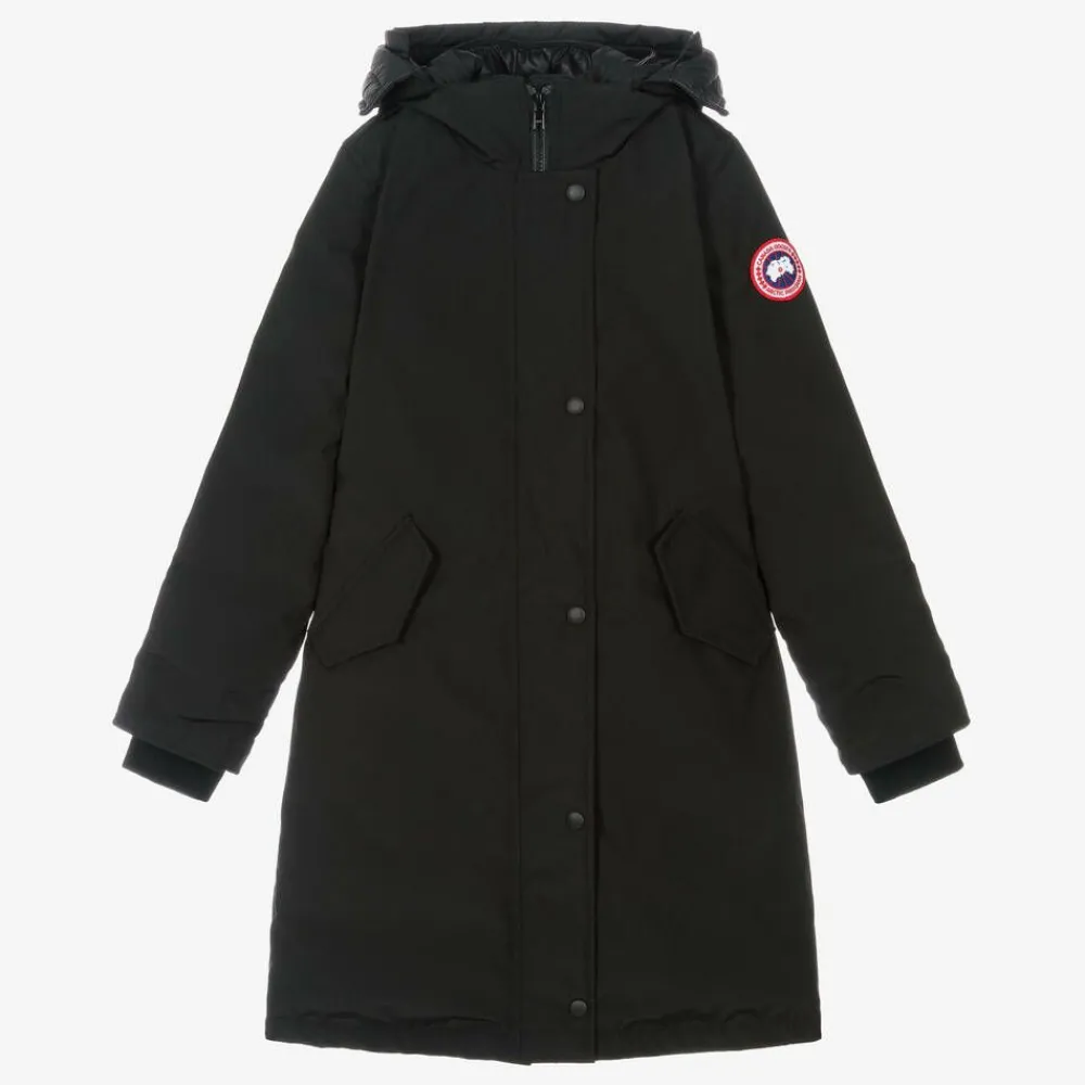 From luxurious outerwear brand Canada Goose, this high-performance black parka coat for boys and girls has the iconic logo patch on the sleeve. Made in the brand's durable, wind-resistant and water-repellent ARCTIC TECH canvas, it is designed to stay warm and dry in extreme conditions and climates thanks to it's luxurious down padding. The sleeves feature recessed, ribbed cuffs with useful glove hooks and extendable fabric to lengthen as your child grows. Reflective stripes help with low-light visibility and the fleece-lined pockets on the front are specially designed to warm hands. It fastens with an easy-to-use zip, shielded by the popper-fastening storm flap for added weather protection.