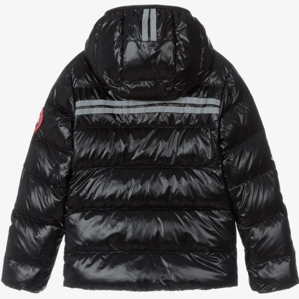 Black Mini-me puffer jacket for boys and girls by luxury designer, Canada Goose. Made in recycled nylon ripstop with a wind-resistant, water-repellent finish, this durable jacket is luxuriously down padded and ultra-lightweight. It is designed to withstand high winds, light rain and snow, and has Power Stretch cuffs to lock in heat. For added visibility in low lights, there are reflective stripes on the back and the hood. It has a branded storm flap, concealed behind the zip fastening on the front, and soft, hand-warming pockets.