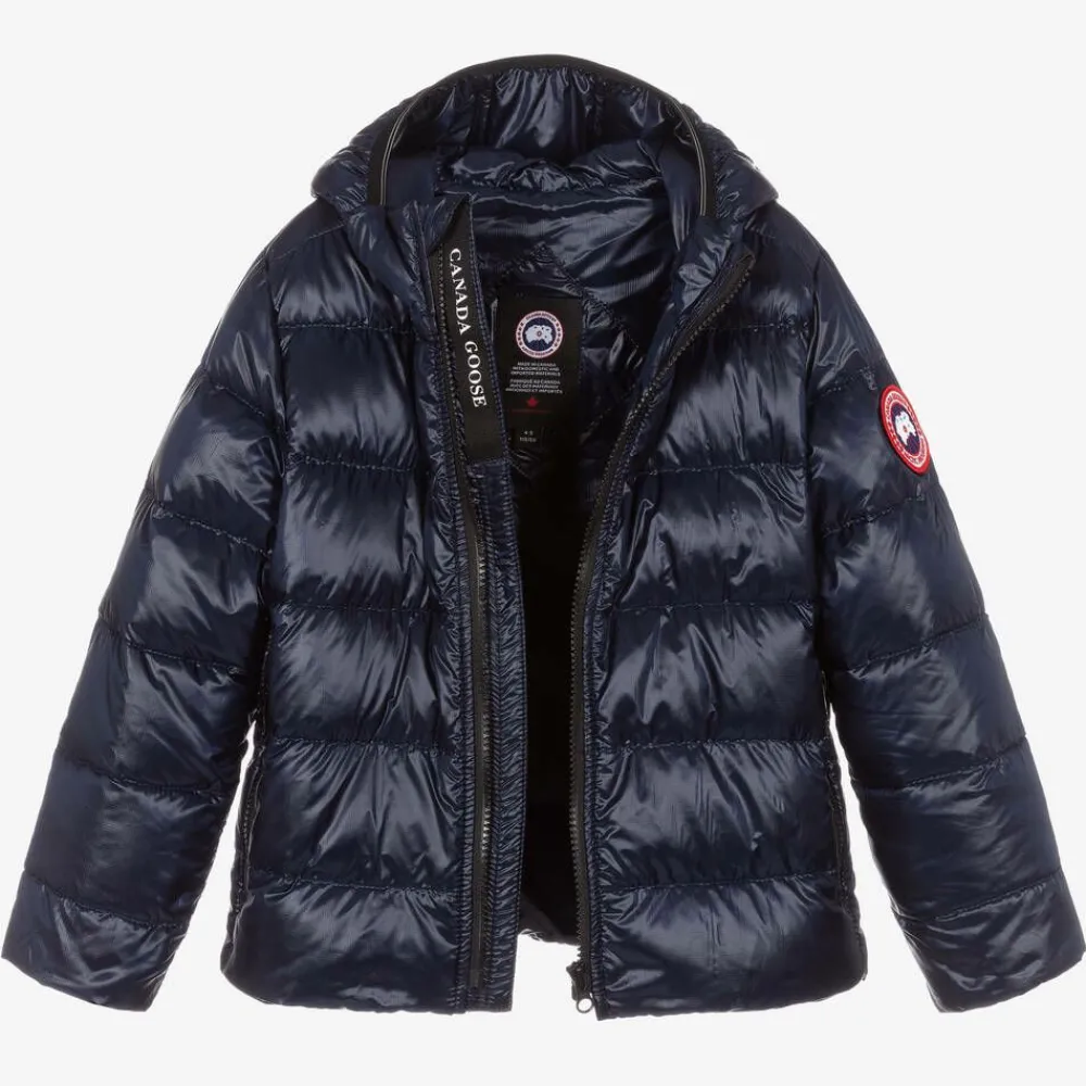 Navy blue Mini-me hooded puffer jacket for younger boys and girls by Canada Goose, made in recycled nylon ripstop with a water repellent finish. The brand's signature logo badge is on one sleeve and printed on the inside of the zip placket on the front. Luxuriously down padded and ultra-lightweight, it is designed to withstand high winds, light rain and snow. For added visibility in low lights, there are reflective stripes on the back and hood. The cuffs are elasticated to keep the elements out and there are two zipped, hand-warming pockets.
