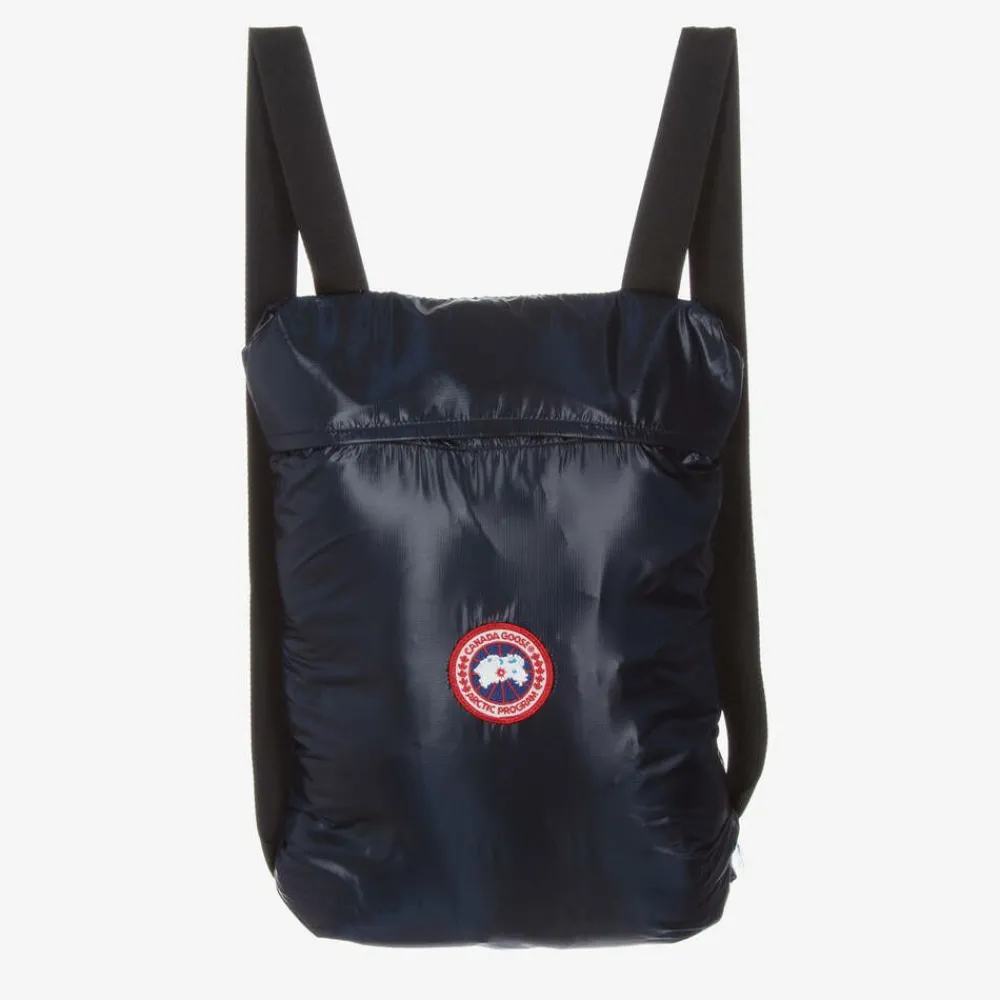 Navy blue Mini-me puffer jacket for girls by luxury brand Canada Goose, with the iconic logo badge on one sleeve. It features reflective trims on the hood, a white logo on the inside of the black zip placket and an elasticated panel on the back for a good fit. There are recessed Power Stretch cuffs on the sleeves to lock in warmth and concealed, hand-warming pockets on the front. Luxuriously down padded, it is made from ultra-lightweight, recycled nylon ripstop with a durable, wind-resistant, water-repellent finish. Designed for light rain, snow and wind, this versatile jacket folds away into the interior pocket to be carried hands-free as a backpack.