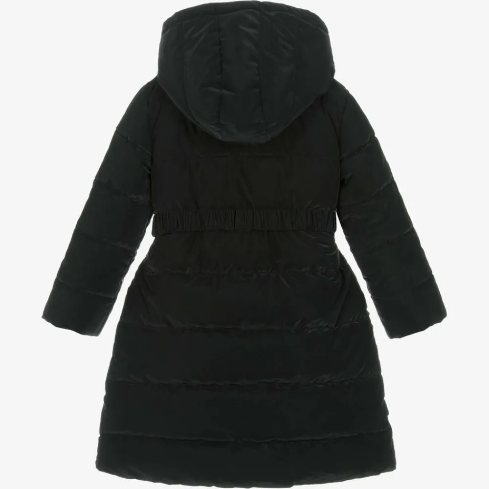 A black puffer coat for girls by Caramelo Kids, with an elasticated bow belt that fastens with poppers. Made from silky, smooth fabric, this stylish hooded coat has discreet side seam pockets and a tonal logo embroidered on the chest for a subtle designer finish. Padded for extra warmth, there is a gold, heart-shaped charm on the front zip fastening for a glamorous touch.