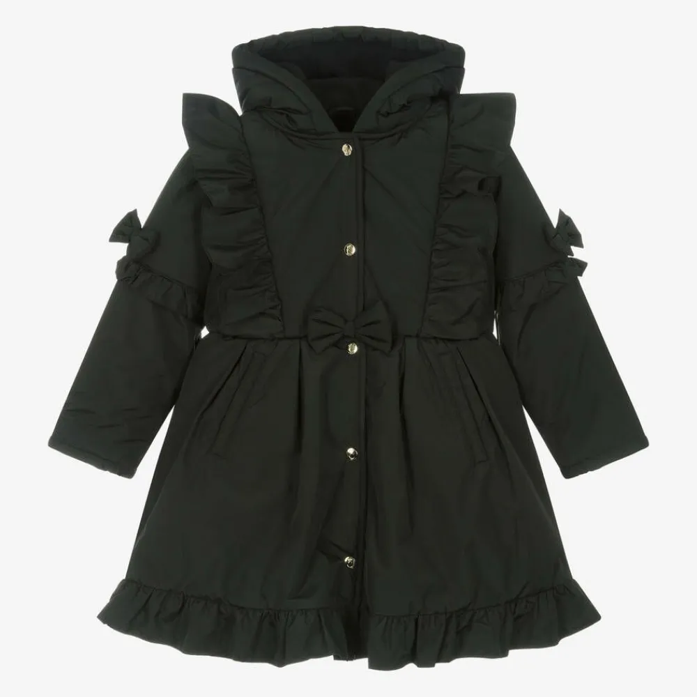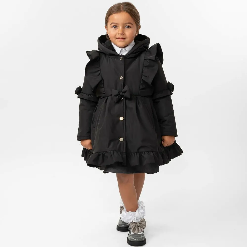 A black hooded coat for girls by Caramelo Kids. Lovely for the cooler weather, this smooth coat with mid-weight padding has a soft microfleece lining for added warmth and cosiness. Fastening with shiny gold logo-engraved poppers on the front, it has handy fleece-lined pockets and is decorated with tonal frills and appliqué bows. For a pretty fit and flare silhouette, it has a skirt-style overlayer with a ruffled hemline for added charm.