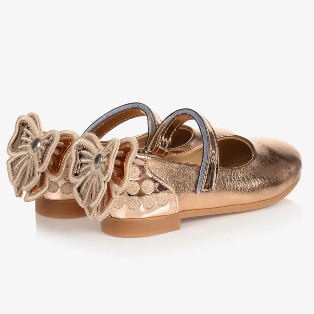 Girls rose gold ballerina shoes by Caramelo Kids. Made in soft leather, with a leather lining and padded inner sole, they have beautiful butterfly wings attached at the heels. They have an ivory patent velcro fastening foot strap, a small heel, and a non-slip rubber outer sole.