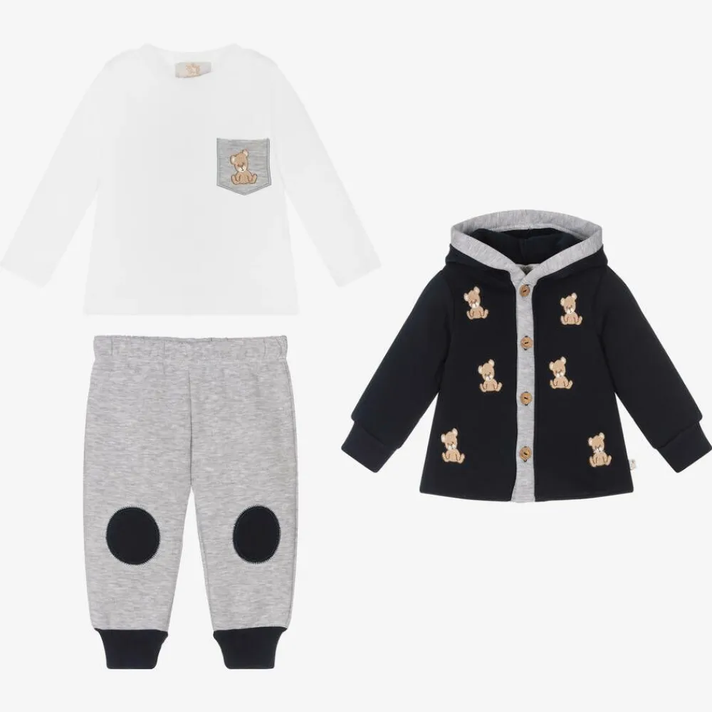 Cute navy blue and grey tracksuit set for little boys from Caramelo Kids, made in soft and comfortable jersey. The white top has long sleeves and a grey chest pocket appliqué with a sweet embroidered teddy bear. The button-fastening hooded top has matching embroidered bears on the front and the joggers have contrast cuffs and knee patches.