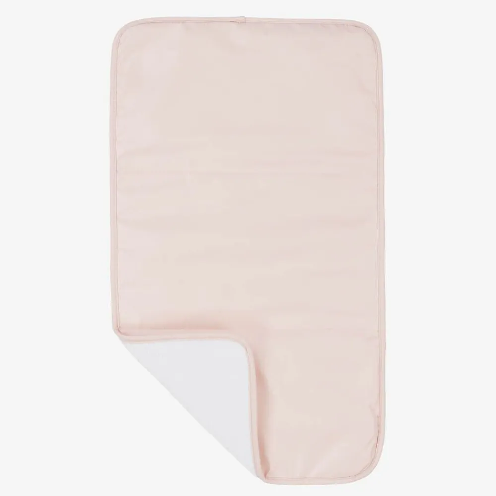 A pale pink changing bag by Carrément Beau, made in silky smooth fabric with stitched detailing and a rounded silhouette. Ideal for new parents, the generous main compartment is fully lined and equipped with interior pockets for neat organisation. Elasticated side pockets provide extra space for essentials. Convenient for days out, it has two carry handles and a detachable shoulder strap that clips on and off easily. It can also be attached to the stroller with two clip straps. This bowling-style changing bag is branded with metallic embroidery and comes with a towelling-lined mat for nappy changes on the go.