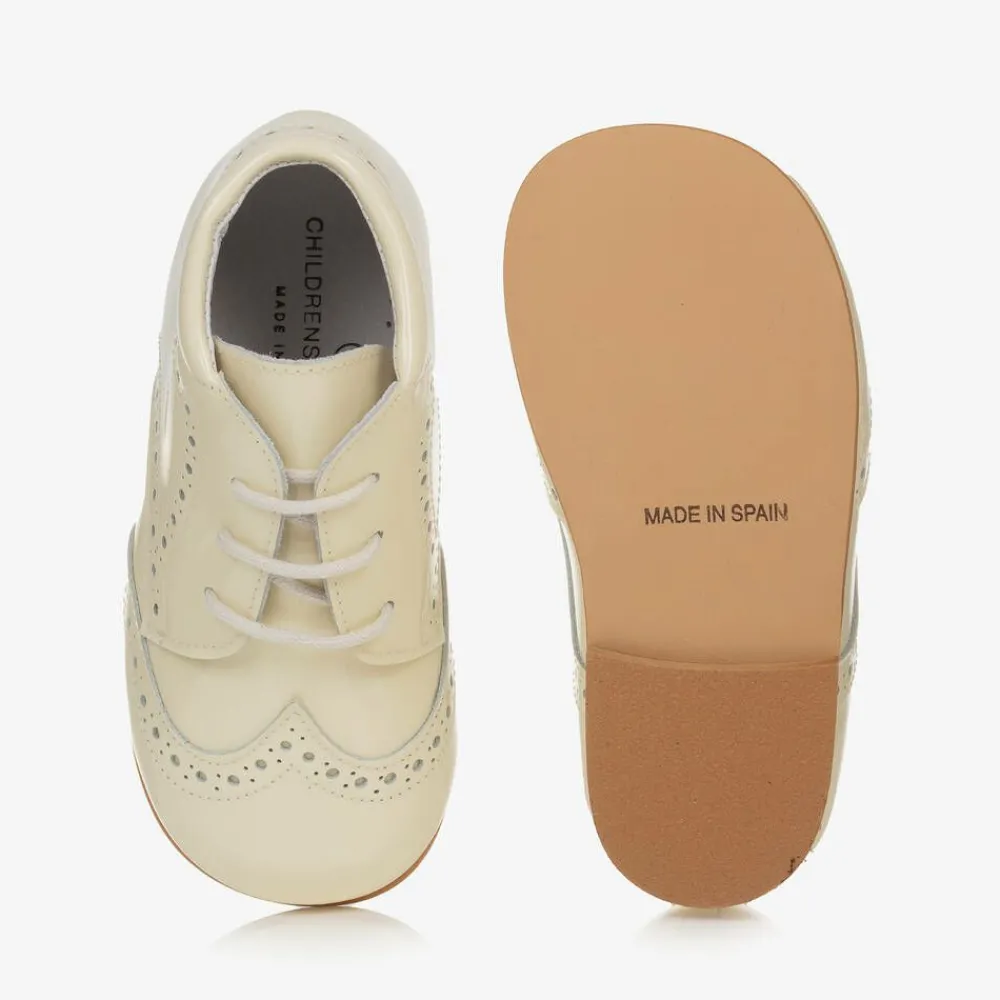 Exclusive to Childrensalon, a pair of ivory patent leather brogue ankle boots by Children's Classics. This beautiful lace-up design has leather lining, lightly padded insole and padded ankle support. They can be worn for smarter occasions or everyday wear by boys and girls.