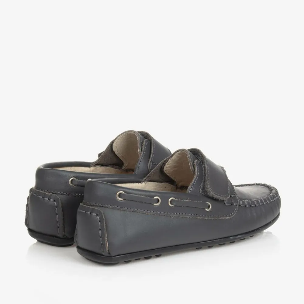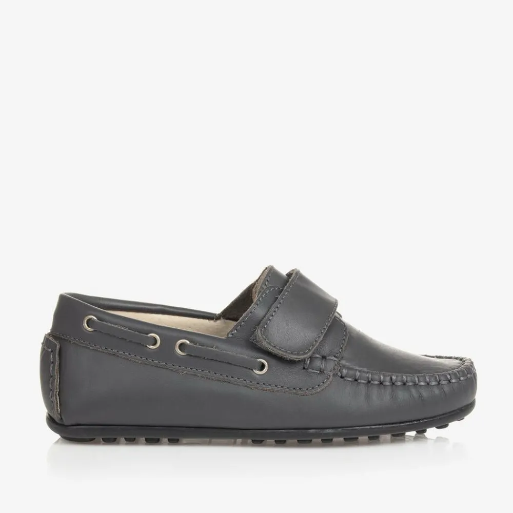 Exclusive to Childrensalon, a pair of dark grey leather moccasin shoes for boys by Children's Classics. Smart and practical, they have a velcro fastening strap and stitched round toes. Fully lined in leather, with a cushioned insole for comfort and pebble grips on the outsole.