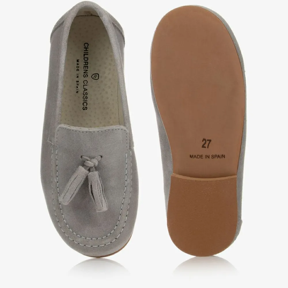 Exclusive to Childrensalon, a pair of grey suede leather shoes for boys from Children's Classics, in a classic loafer style with tassels on the front. These slip-on shoes have a soft leather lining with a cushioned insole and a non-slip rubber sole.