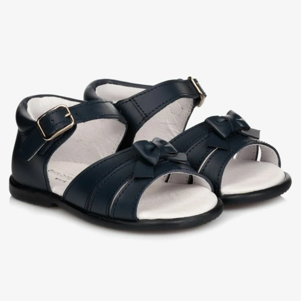 Exclusive to Childrensalon, navy blue sandals for little girls by Children's Classics. Made from soft leather and lightly padded, the strap across the foot has a pretty navy blue bow on the front.