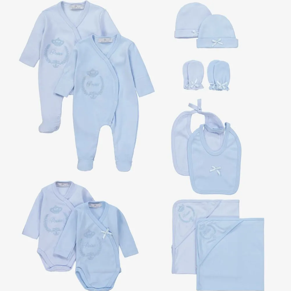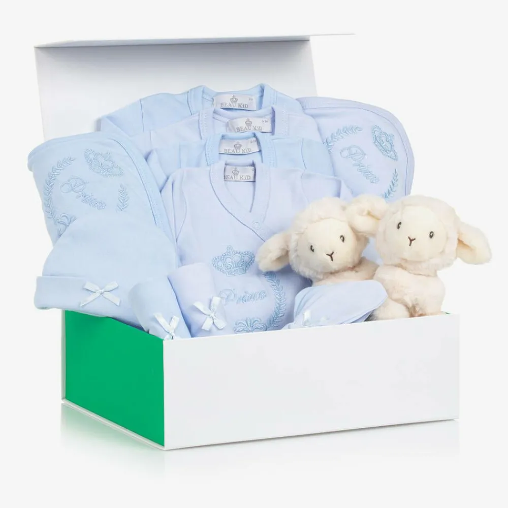 Exclusive to Childrensalon, this adorable hamper for newborn twin boys is designed by Childrensalon Hampers. Introducing tiny twins to the world with a thoughtful surprise, it comes with two of every item. The Beau Kid popper fastening babygrows and bodyvests are all embroidered with sweet crests on the chest, with 'Prince' in the centre for a cute touch. Layette hats, scratch mitts, bibs, hooded blankets and snuggly Aurora sheep rattles all are included in this lovely set, presented in a beautiful gift box.