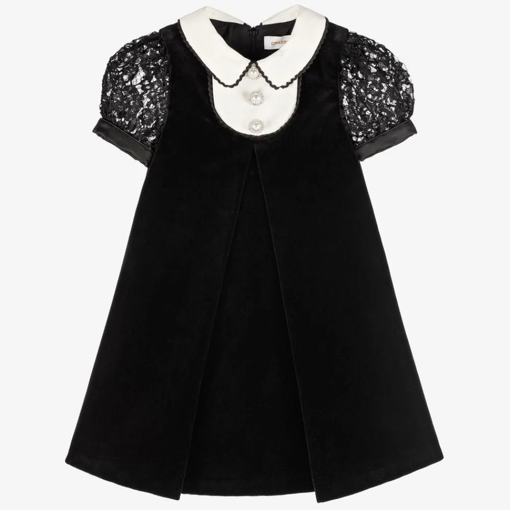 Gorgeous black velvet dress for girls by Childrensalon Occasions, ideal for a special event. Luxuriously soft, it has a slightly textured white collar and bib front, trimmed with black ric rac and decorated with diamanté-encrusted pearl buttons. The prettily puffed, sheer lace sleeves have satin cuffs and the large, inverted pleat on the front gives shape and structure.