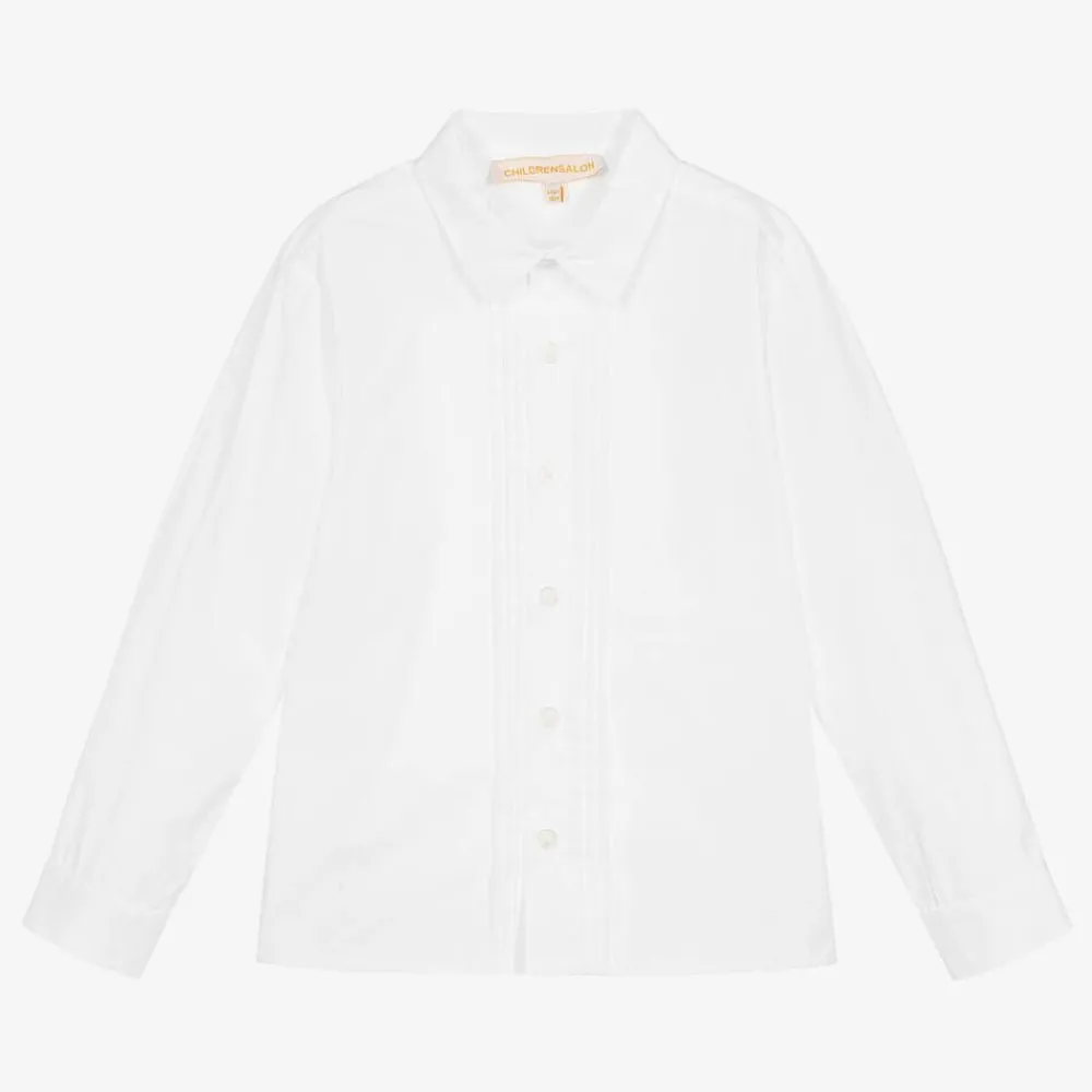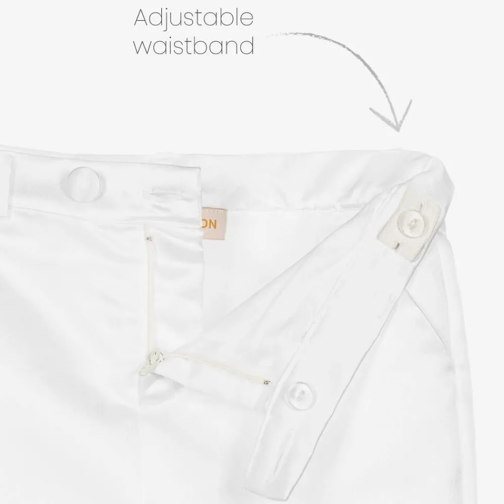 Stylish and super-smart, this white 5-piece suit for boys is by Childrensalon Occasions. Made in sumptuous, mid-weight satin, the jacket, waistcoat and trousers all fasten with satin-covered buttons and have a silky lining for comfort. The slightly fitted jacket has a faux chest pocket and handkerchief, with front pockets and decorative buttons on the cuffs. For a good fit, the waistcoat has adjustable straps on the back and the trousers have an adjustable waistband. The front of the trousers have pockets and a zip fastening, whilst there are faux pockets around the back. A cotton shirt completes the set, with a detachable satin bow tie, front pleats and logo button fastenings on the front and cuffs.