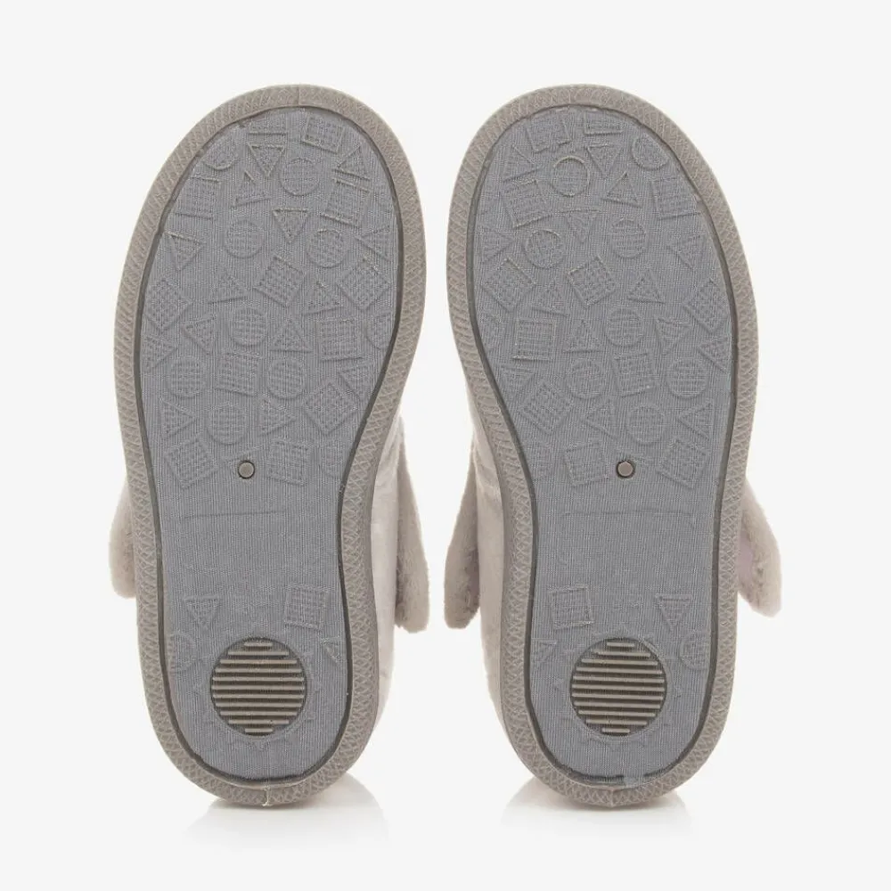 Grey slippers for girls by Chipmunks, made and lined in cosy plush fleece. They have an adorable little penguin with a bow detail embroidered on the front. Fastening easily with velcro, these comfortable slippers have padded insoles for extra support. The rubberised sole is flexible and treaded for safety.