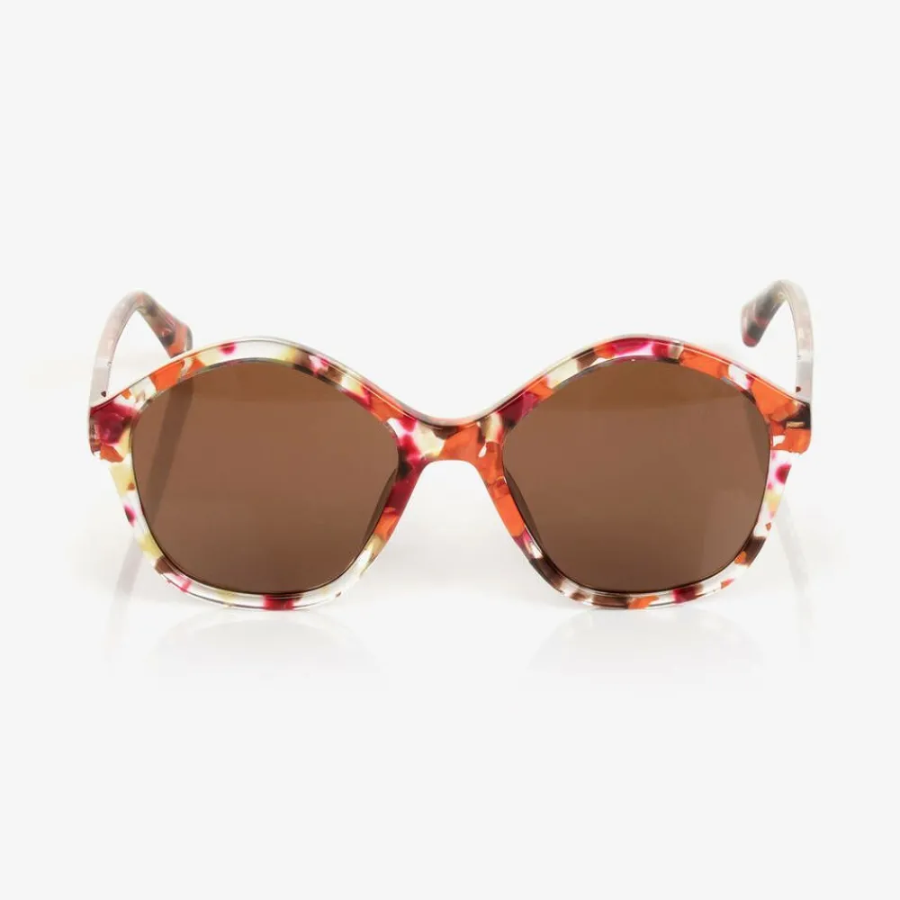 Chic geometric sunglasses for girls by luxury designer Chloé, with a brown, pink, and orange tortoiseshell-inspired design. The brown tinted lenses have a category filter of 3, providing high protection against sun glare. Subtly branded with a gold logo on one arm, these stylish sunglasses come with a pink branded zip-up pouch and care cloth.
