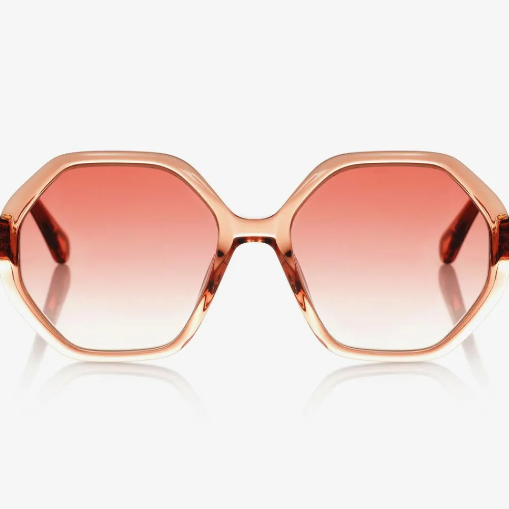 Clear orange sunglasses for girls by luxury French designer Chloé, featuring the brand's iconic hexagonal-shaped frame. They have stylish gradient lenses with a category 2 filter, providing good protection against sun glare. They have braided detailing on the side and a gold logo on the left temple. The sunglasses come in a branded protective carry case with a matching care cloth.