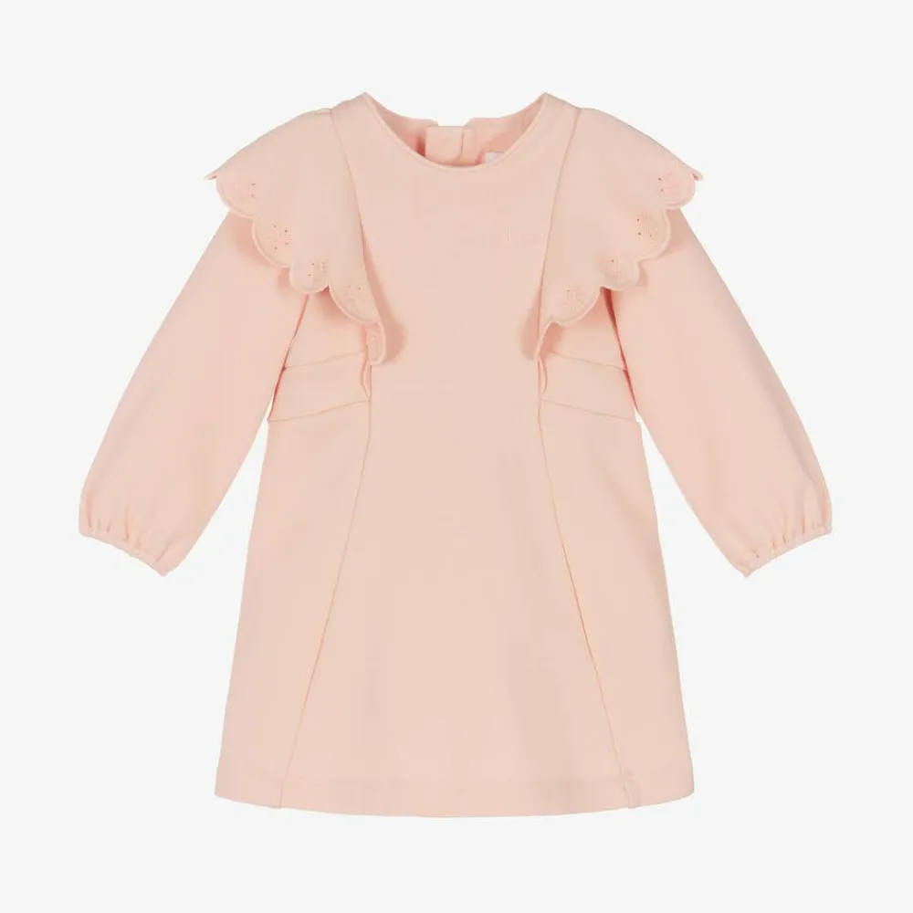 Pretty pink long-sleeved dress for baby girls by luxury French designer Chloé, made in a cotton and viscose blend jersey. It has large, scalloped frills on the lined bodice, beautifully embroidered with flowers. The dress is panelled, creating a flared design, with subtle logo embroidery on one side and gently elasticated cuffs. It fastens with a concealed zip on the back.