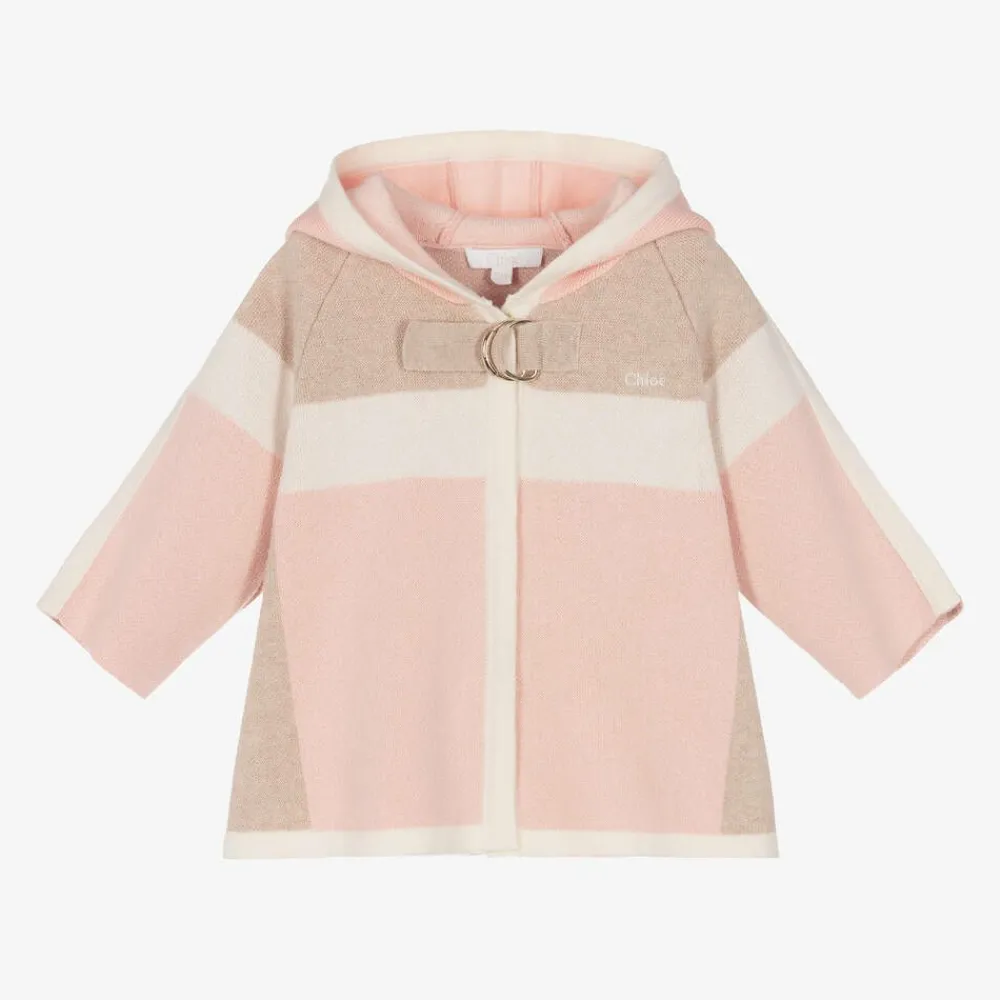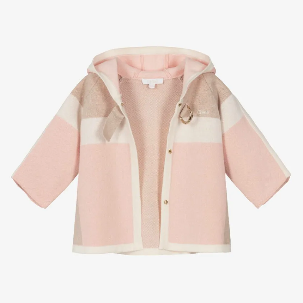 A charming colourblock cardigan for little girls by luxury brand Chloé, in lovely pale pink, ivory, and beige shades. Inspired by the signature Chloé cape, it is knitted in a soft organic cotton and wool blend and has a white embroidered logo on the chest for a subtly branded look. Designed with a delightful hood, it has concealed popper fastenings on the front and a stylish gold logo-embossed D-ring on the neckline.