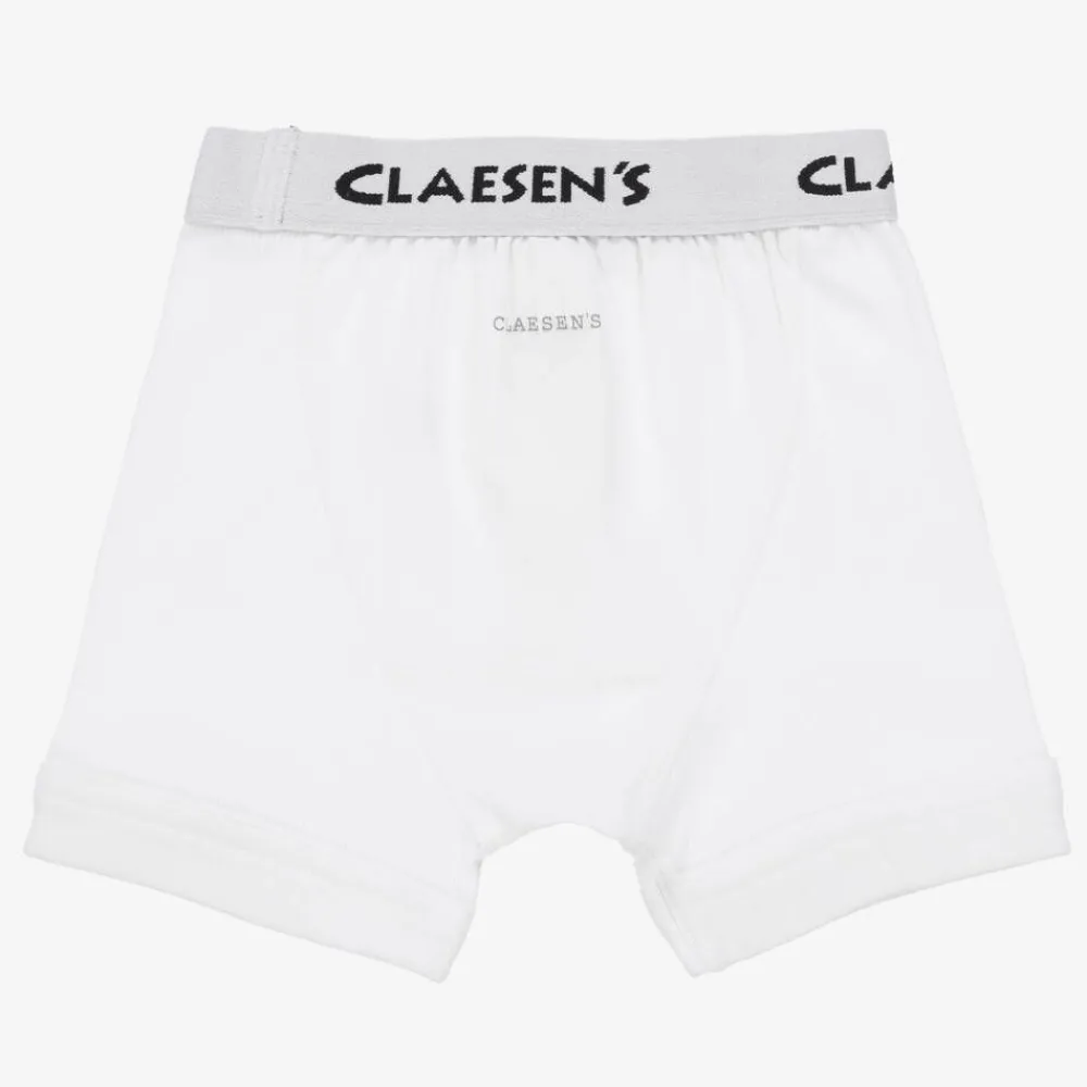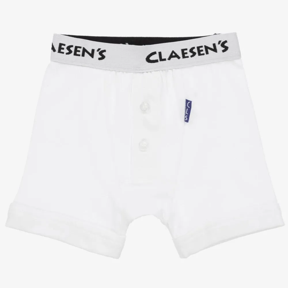 Pack of two white boxer shorts for boys by Claesen's, made in soft cotton ribbed jersey. Comfortable to wear, they have an elasticated waistband, with a repeat logo in black and button front fastenings.