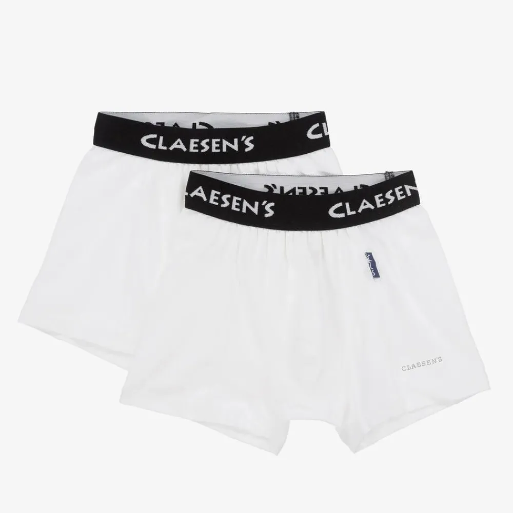 Pack of two white boxer shorts for boys by Claesen's, made in soft cotton jersey. These comfortable boxers have the brand's logo on the waistband for added designer appeal.
