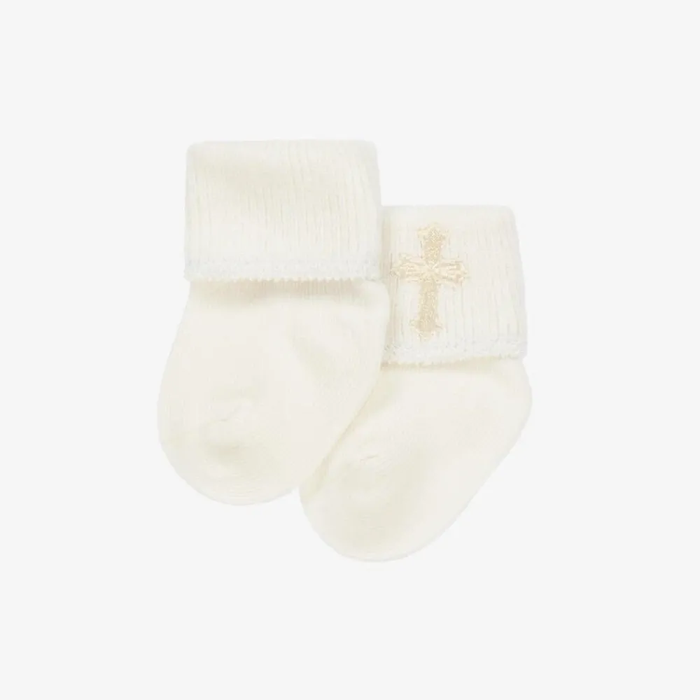 Gorgeous little ivory socks for baby boys and girls by Country Kids, made from a soft and stretchy cotton blend knit. An ideal Christening accessory, they are embroidered with religious symbols on the cuffs.