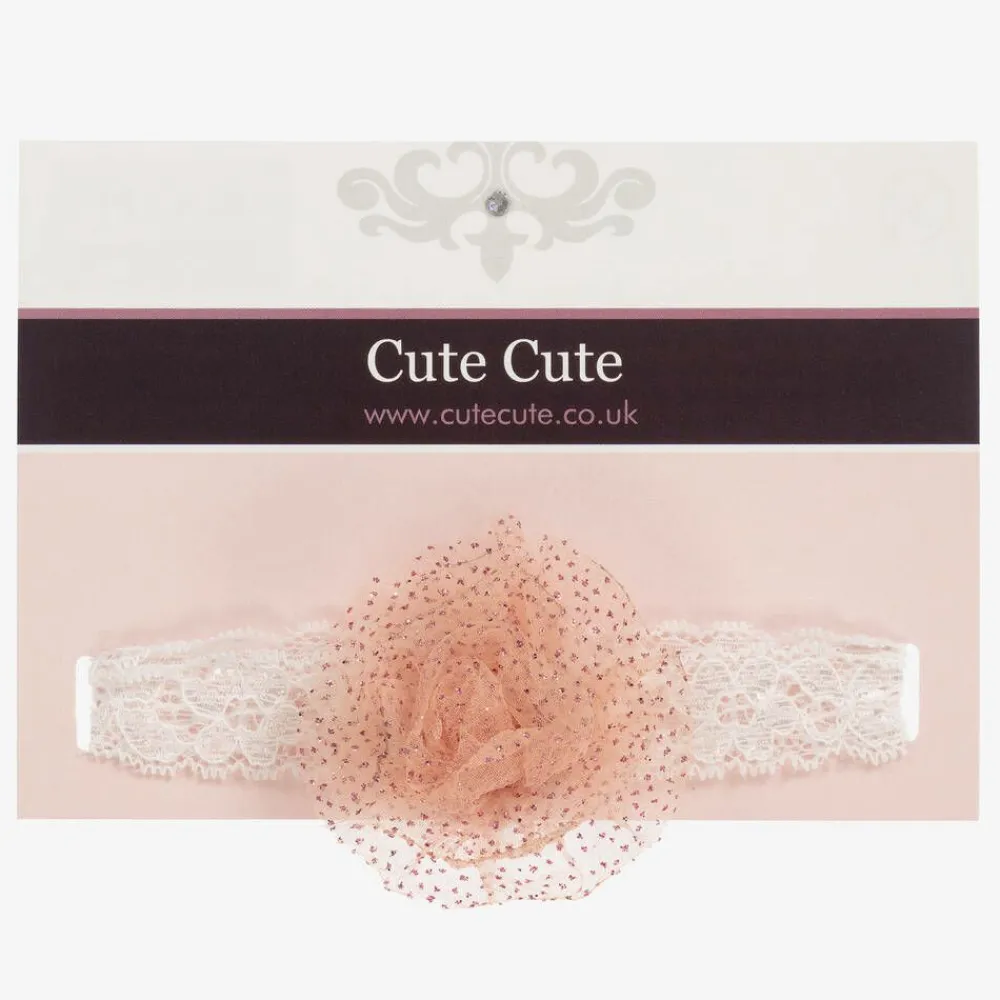Cute Cute girls dusky pink tulle flower headband with micro glitter. It is attached to a soft, very stretchy ivory lace elastic band.