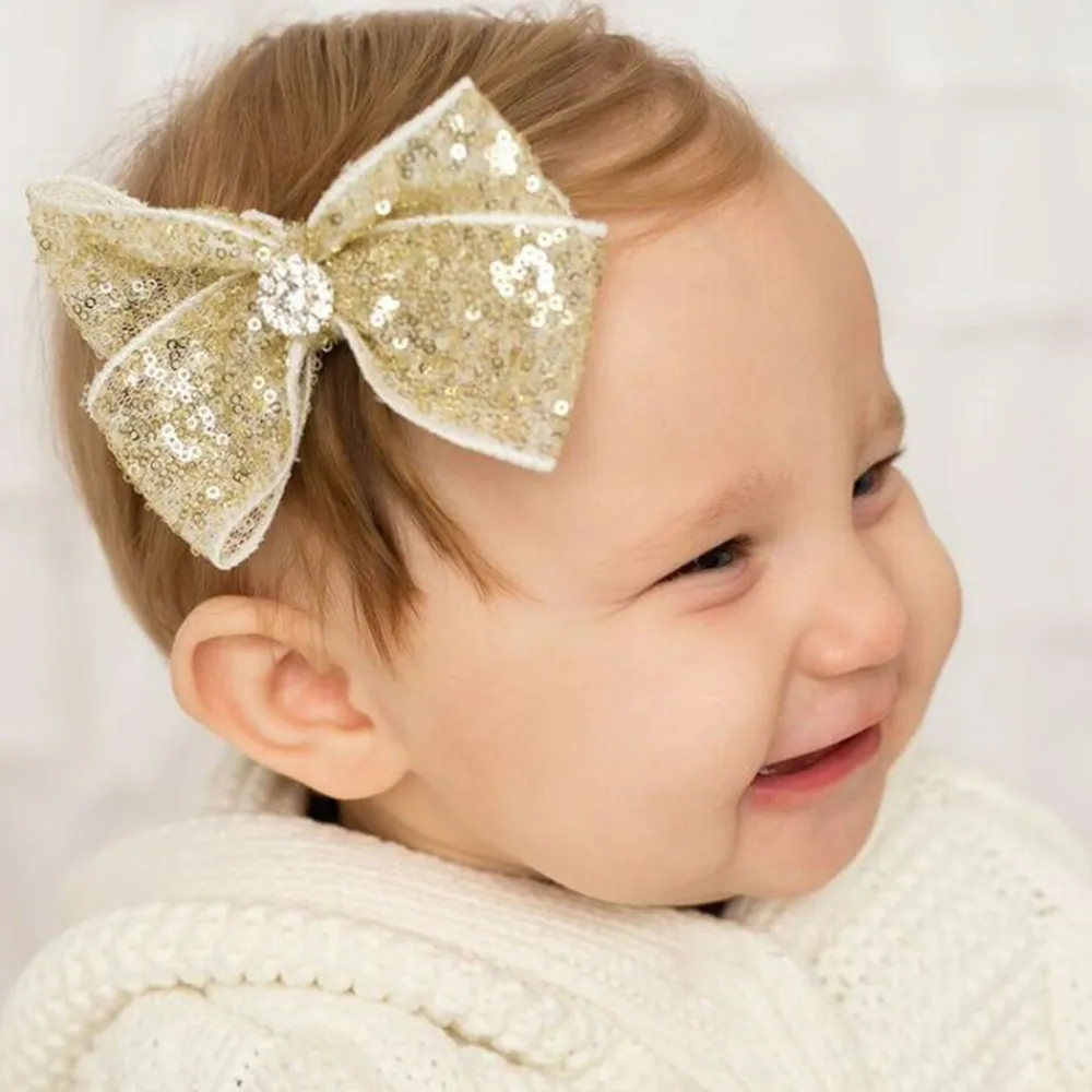 Girls handmade hair clip by Cute Cute, made from ivory ribbon with gold sequins and a diamanté centre. This pretty hair accessory secures with a metal clip.