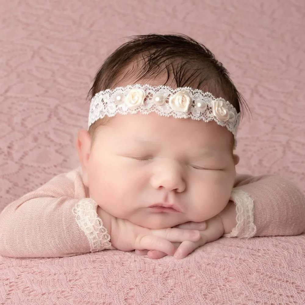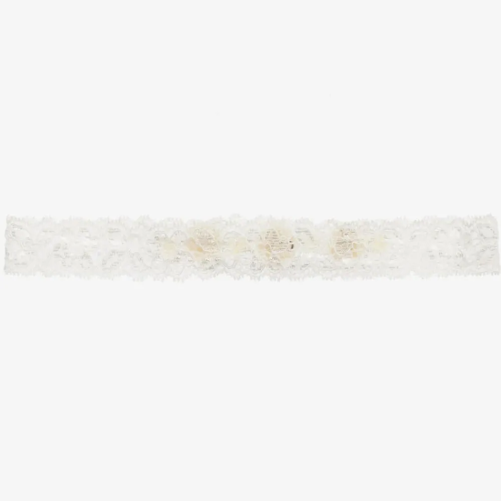 A sweet ivory headband for baby girls by Cute Cute, with satin roses and pearls on a stretchy elasticated lace band.