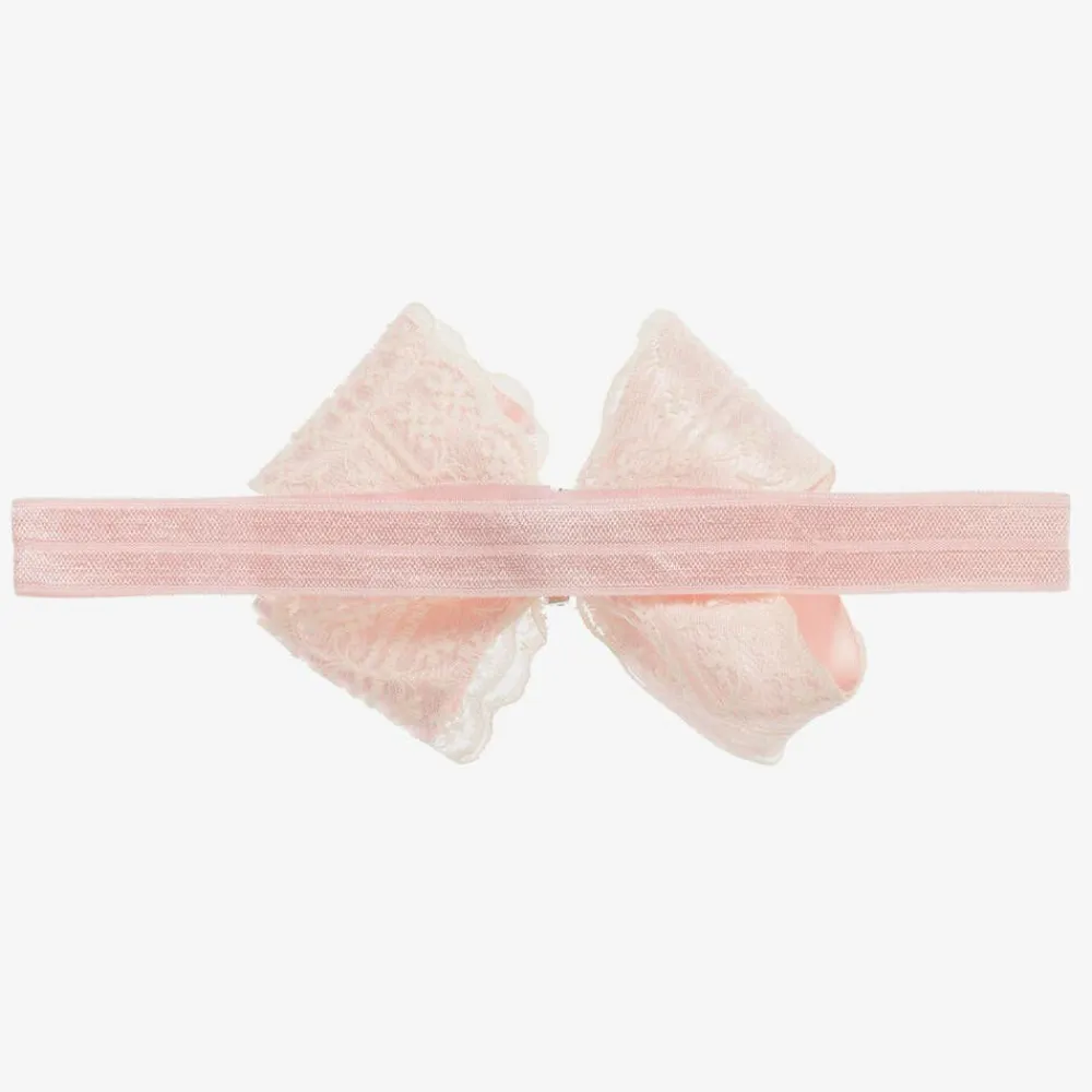 Girls pink headband by Cute Cute. This pretty handmade headband has a pink satin and ivory lace bow with a pearl and diamanté centre.