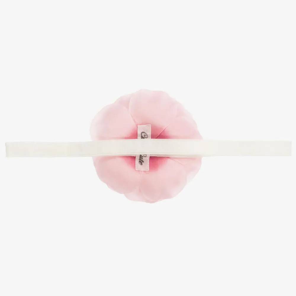 Cute Cute girls pink silk flower headband with a pearl and diamanté centre. It is attached to a soft, very stretchy ivory velour elastic band.