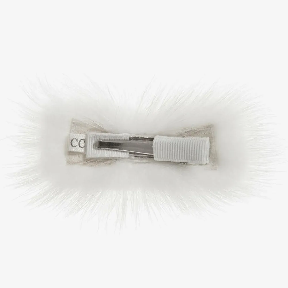 An adorable handmade hair clip by British brand Cute Cute, with gorgeous ivory faux fur and a sweet little diamanté teddy bear. Gentle on the hair the metal clip is covered in soft grosgrain ribbon.