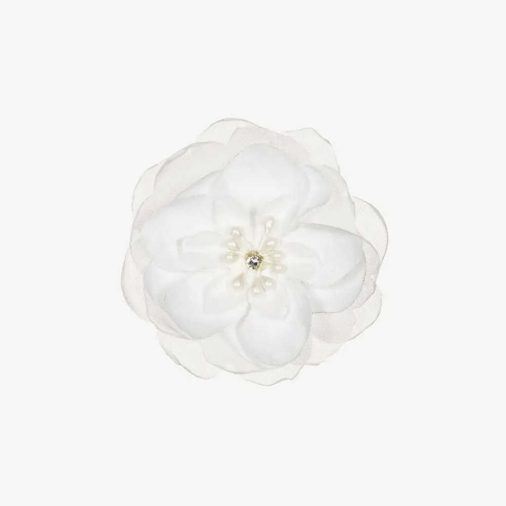 Girls sweet white handmade hair clip by Cute Cute. Lovely for a special occasion, the metal clip is decorated with a white satin and chiffon flower, with pearls and sparkling diamanté detailing.