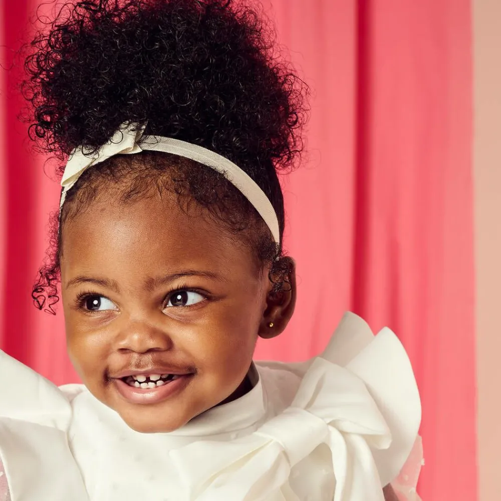 Lovingly handmade, this white headband by Cute Cute is elasticated and soft. It has a pretty glitter bow with a small diamanté at its centre.