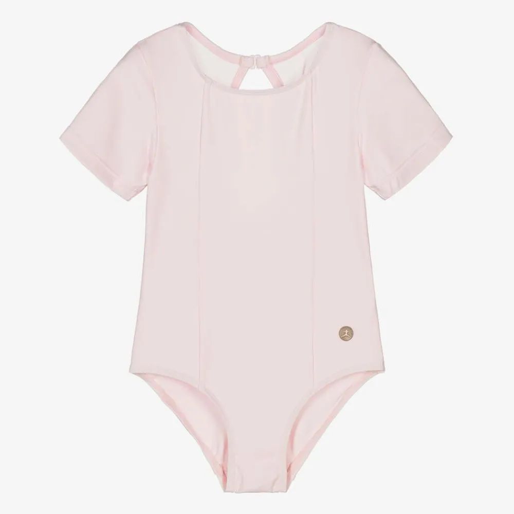 Pale pink leotard for girls by dancewear designer, Danskin. Made using the designer's super soft four-way stretch fabric for free movement, this style is ideal for ballet and dance classes. It has a mesh panel on the back with an open panel and stylish ruching. It is comfortable, breathable and fastens with a clasp on the back of the neck. Rose gold logo prints add a touch of branded shine to the piece.