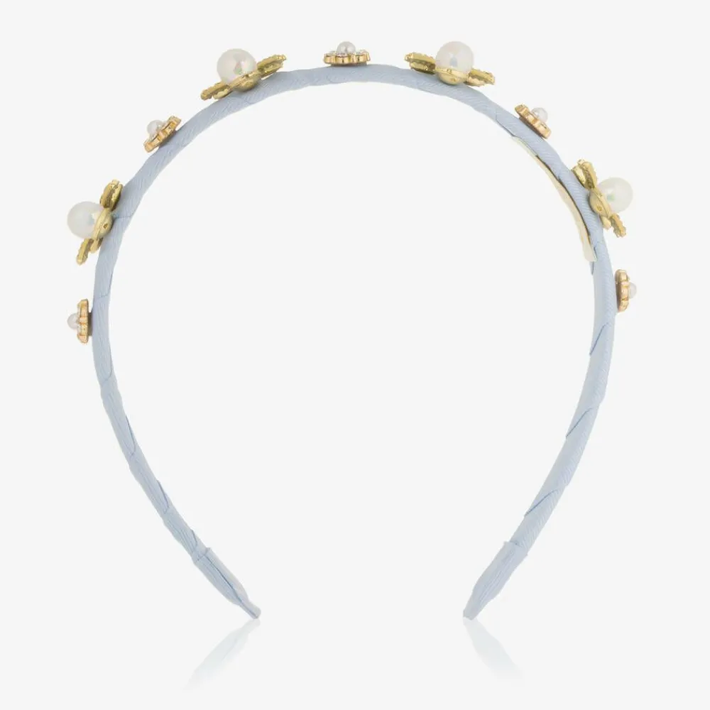 A pretty pale blue hairband for girls from David Charles. The flexible band is covered with ribbon and adorned with sparkly bow and flower charms.